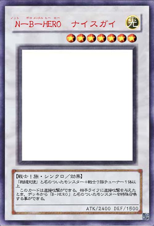 「裁縫天使」と名のついたモンスター+戦士?族チューナー1体以上 このカードは直接攻撃ができる。相手ライフに直接攻撃を与えたとき、デッキから「B-HERO」と名のついたモンスターを特殊召喚 する事ができる。 |