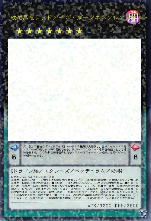 | ①:自分の墓地の「レッドアイズ」カードが5種類以上存在し、自分フィールドにモンスターが存在しない時に発動できる。PゾーンのこのカードをP召喚扱いとして特殊召喚する。この効果で特殊召喚したモンスターはフィールドから離れた際にゲームから除外される。 | |||