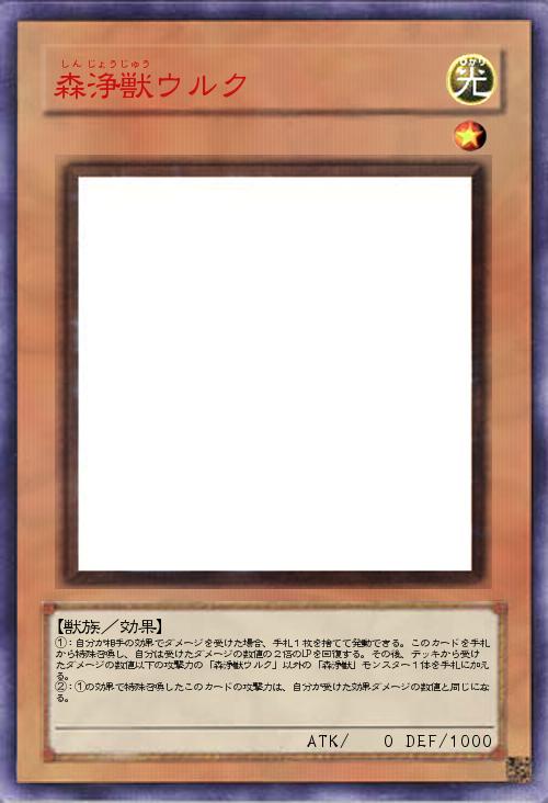 | ①:自分が相手の効果でダメージを受けた場合、手札1枚を捨てて発動できる。このカードを手札から特殊召喚し、自分は受けたダメージの数値の2倍のLPを回復する。その後、デッキから受けたダメージの数値以下の攻撃力の「森浄獣ウルク」以外の「森浄獣」モンスター1体を手札に加える。 ②:①の効果で特殊召喚したこのカードの攻撃力は、自分が受けた効果ダメージの数値と同じになる。 | |||