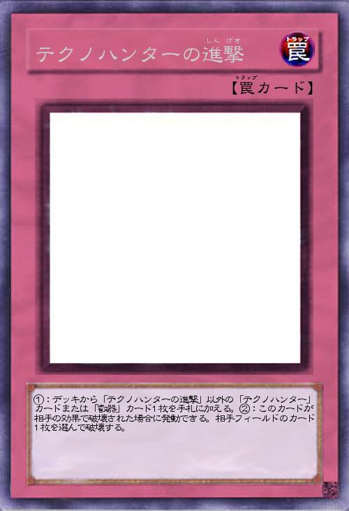 | ①:デッキから「テクノハンターの進撃」以外の「テクノハンター」カードまたは「叡器」カード1枚を手札に加える。②:このカードが相手の効果で破壊された場合に発動できる。相手フィールドのカード1枚を選んで破壊する。 | |||
