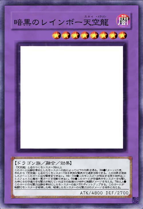 | 「天空龍」と名のつくモンスター3体以上 このカードは融合素材としたモンスターの数によって以下の効果を得る。3体●1ターンに1度、手札から「天空龍」と名のつくモンスター1体を表側攻撃表示で通常召喚できる。この効果を使用したターンこのカードは攻撃宣言できない。4体・5体●このモンスターが存在する限り相手はバトルフェイスに魔法・罠カードを発動できない。6体●このカードが守備表示モンスターを攻撃した時にその守備力を攻撃力が超えていればその数値だけ相手に戦闘ダメージを与える。7体以上●このカードの攻撃力は融合素材にしたモンスターの数×500ポイントアップする。このカードが戦闘でモンスターを破壊した時、破壊したモンスターの攻撃力分のダメージを相手に与える。 | |||