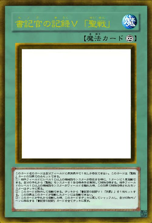 | このカード名のカードは自分フィールドに表側表示で1枚しか存在できない。このカードは「聖戦」カードの効果でのみセットできる。 ①:相手フィールドにレベル10以上の機械族モンスターが存在する時に、1ターンに1度発動できる。自分の手札から「聖戦」モンスターを1体召喚条件を無視して特殊召喚する。相手フィールドのレベル10以上の機械族モンスターがフィールドを離れた時、この効果で特殊召喚されたモンスターはデッキに戻る。 ②:このカードを除外して発動できる。デッキから「書記官の記録VI「天罰」」を1枚セットする。この効果はこのカードが発動したターンには発動できない。 ③:このカードが手札から発動した時、このカードをデッキに戻してシャッフルし、自分の除外ゾーンに存在する「書記官の記録」カードを全てデッキに戻す。 | |||