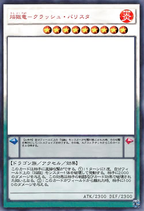 | このカードは相手に直接攻撃ができる。①:1ターンに1度、自分フィールド上の「焔獄」モンスター1体を破壊して発動する。相手に2000のダメージを与える。この効果は相手の戦闘及びカード効果で破壊された扱いとなる。②:このカードがフィールドから離れた時、相手に1000のダメージを与える。 | |||