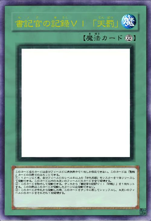 | このカード名のカードは自分フィールドに表側表示で1枚しか存在できない。このカードは「聖戦」カードの効果でのみセットできる。 ①:1ターンに1度、自分フィールドのレベル5以上の「古代兵器」モンスターを1体リリースして発動できる。このカード以外のお互いのフィールドのカードを全て破壊する。 ②:このカードを除外して発動できる。デッキから「書記官の記録VII「終戦」」を1枚セットする。この効果はこのカードが発動したターンには発動できない。 ③:このカードが手札から発動した時、このカードをデッキに戻してシャッフルし、お互いのフィールドのカードをそれぞれ1枚破壊する。 | |||