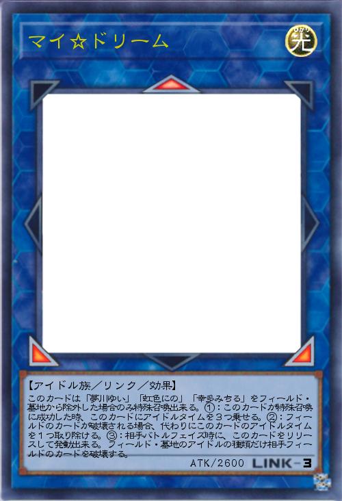 | このカードは「夢川ゆい」「虹色にの」「幸多みちる」をフィールド・墓地から除外した場合のみ特殊召喚出来る。①:このカードが特殊召喚に成功した時、このカードにアイドルタイムを3つ乗せる。②:フィールドのカードが破壊される場合、代わりにこのカードのアイドルタイムを1つ取り除ける。③:相手バトルフェイズ時に、このカードをリリースして発動出来る。フィールド・墓地のアイドルの種類だけ相手フィールドのカードを破壊する。 | |||