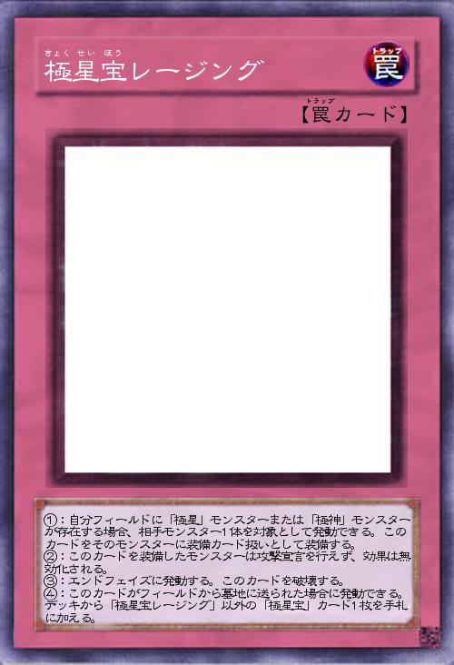| ①:自分フィールドに「極星」モンスターまたは「極神」モンスターが存在する場合、相手モンスター1体を対象として発動できる。このカードをそのモンスターに装備カード扱いとして装備する。 ②:このカードを装備したモンスターは攻撃宣言を行えず、効果は無効化される。 ③:エンドフェイズに発動する。このカードを破壊する。 ④:このカードがフィールドから墓地に送られた場合に発動できる。デッキから「極星宝レージング」以外の「極星宝」カード1枚を手札に加える。 | |||