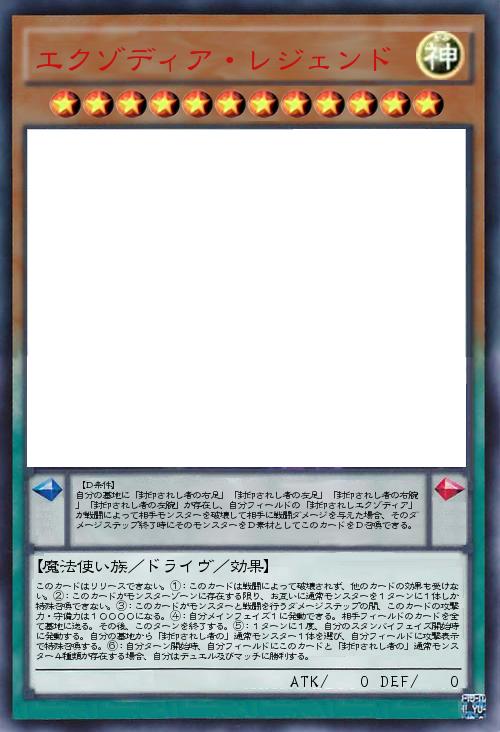| 【D条件】 自分の墓地に「封印されし者の右足」「封印されし者の左足」「封印されし者の右腕」「封印されし者の左腕」が存在し、自分フィールドの「封印されしエクゾディア」が戦闘によって相手モンスターを破壊して相手に戦闘ダメージを与えた場合、そのダメージステップ終了時にそのモンスターをD素材としてこのカードをD召喚できる。 | |||