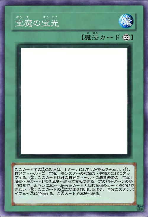 | このカード名の②の効果は、1ターンに1度しか発動できない。①:自分フィールドの「宝魔」モンスターの攻撃力・守備力は100アップする。②:このカード以外の自分フィールドの表側表示の「宝魔」魔法・罠カード1枚を墓地へ送って発動できる。次の相手ターンの終了時まで、お互いに墓地へ送ったカードと同じ種類のカードを発動できない。③:このカードの②の効果を使用した場合、自分のスタンバイフェイズに発動する。このカードを墓地へ送る。 | |||