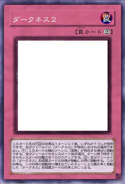 | このカード名の①②の効果は1ターンに1度、いずれか1つしか使用できず、自分フィールドに「ダークネス」が存在しなければ適用できない。①:このカードの隣のゾーンに「虚無」が存在する場合に発動できる。自分フィールドのモンスター1体を選び、ターン終了時までそのモンスターの攻撃力を1000アップする。②:自分フィールドの「ダークネス」永続罠カードの効果が発動した時に発動する。この効果は、この効果の発動時に積まれていたチェーン上で最も早く発動した「ダークネス」永続罠カードの効果と同じになる。 | |||