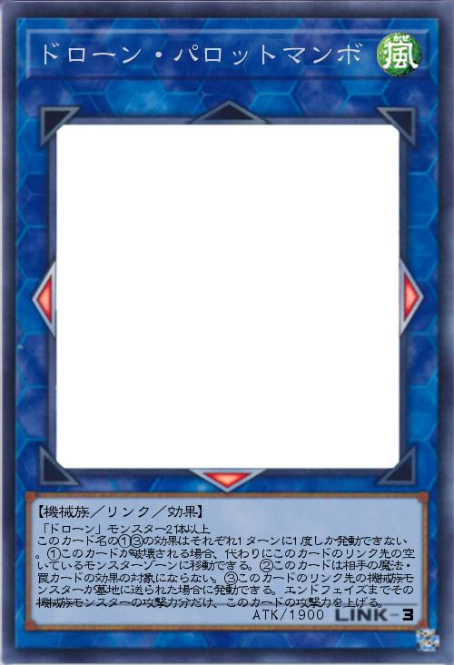 | 「ドローン」モンスター2体以上 このカード名の①③の効果はそれぞれ1ターンに1度しか発動できない。①このカードが破壊される場合、代わりにこのカードのリンク先の空いているモンスターゾーンに移動できる。②このカードは相手の魔法・罠カードの効果の対象にならない。③このカードのリンク先の機械族モンスターが墓地に送られた場合に発動できる。エンドフェイズまでその機械族モンスターの攻撃力分だけ、このカードの攻撃力を上げる。 | |||
