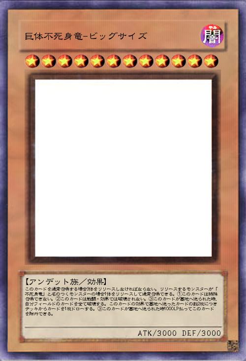 | このカードを通常召喚する場合3体をリリースしなければならない。リリースするモンスターが「不死身竜」と名のつくモンスターの場合1体をリリースして通常召喚できる。①このカードは特殊召喚できない。②このカードは戦闘・効果では破壊されない。③このカードが墓地へ送られた時、自分フィールドのカードを全て破壊する。このカードの効果で墓地へ送ったカードの数2枚につきデッキからカードを1枚ドローする。③このカードが墓地へ送られた時1000LP払ってこのカードを除外できる。 | |||