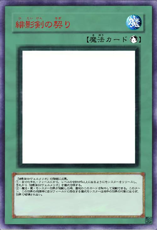 | 「緋影剣士ヴェルメリオ」の降臨に必要。 ①:自分の手札・フィールドから、レベルの合計が8以上になるようにモンスターをリリースし、手札から「緋影剣士ヴェルメリオ」を儀式召喚する。 ②:魔法・罠・モンスター効果が発動した時、墓地のこのカードを除外して発動できる。このターン、この効果の処理時に自分フィールドに存在する儀式モンスターは相手の効果の対象にならず、効果で破壊されない。 | |||