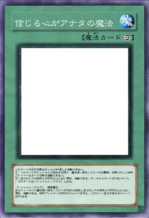 | このカードの②の効果はデュエル中1度しか発動できない。 ①:このカードがフィールドに存在する限り、魔法使い族モンスターの攻撃時、効果に対して相手プレイヤーはカード効果を発動できない。 ②:自分のLPが相手より6000以上少ない場合、発動できる。デッキからカードを1枚ドローし、そのカードは「シャイニイ・アルク」となる。 「シャイニイ・アルク」 通常魔法 自分フィールドに魔法使い族モンスターが1体のみ存在し自分のLPが相手より6000以上少ない場合、発動できる。相手プレイヤーに6000のダメージを与え、このターン自分が受けるダメージは0になる。 | |||