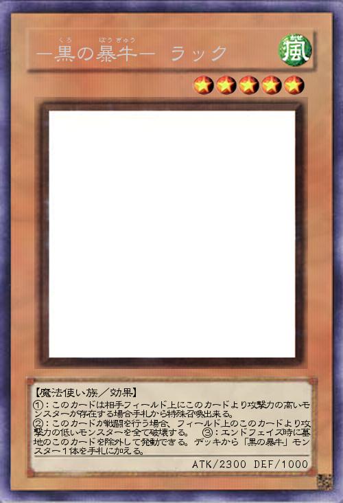 | ①:このカードは相手フィールド上にこのカードより攻撃力の高いモンスターが存在する場合手札から特殊召喚出来る。 ②:このカードが戦闘を行う場合、フィールド上のこのカードより攻撃力の低いモンスターを全て破壊する。 ③:エンドフェイズ時に墓地のこのカードを除外して発動できる。デッキから「黒の暴牛」モンスター1体を手札に加える。 | |||