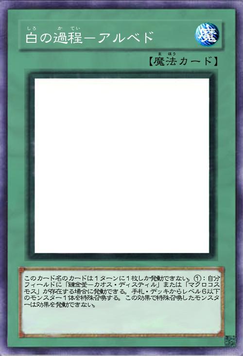 | このカード名のカードは1ターンに1枚しか発動できない。①:自分フィールドに「錬金釜-カオス・ディスティル」または「マクロコスモス」が存在する場合に発動できる。手札・デッキからレベル6以下のモンスター1体を特殊召喚する。この効果で特殊召喚したモンスターは効果を発動できない。 | |||