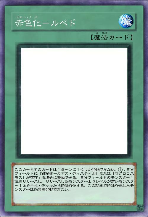 | このカード名のカードは1ターンに1枚しか発動できない。①:自分フィールドに「錬金釜-カオス・ディスティル」または「マクロコスモス」が存在する場合に発動できる。自分フィールドのモンスター1体をリリースし、リリースしたモンスターよりレベルが高いモンスター1体を手札・デッキから特殊召喚する。この効果で特殊召喚したモンスターは効果を発動できない。 | |||