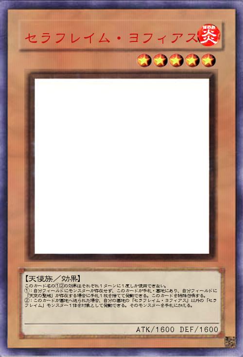 | このカード名の①②の効果はそれぞれ1ターンに1度しか使用できない。 ①:自分フィールドにモンスターが存在せず、このカードが手札・墓地にあり、自分フィールドに「天空の聖域」が存在する場合に手札1枚を捨てて発動できる。このカードを特殊召喚する。 ②:このカードが墓地へ送られた場合、自分の墓地の「セラフレイム・ヨフィアス」以外の「セラフレイム」モンスター1体を対象として発動できる。そのモンスターを手札に加える。 | |||