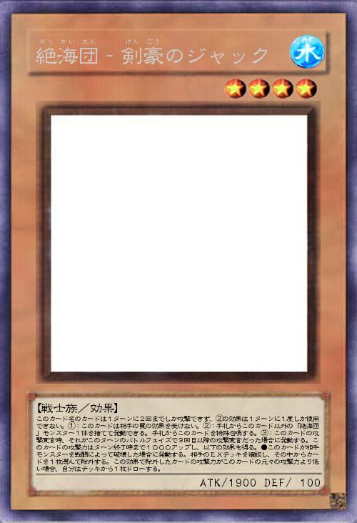 | このカード名のカードは1ターンに2回までしか攻撃できず、②の効果は1ターンに1度しか使用できない。①:このカードは相手の罠の効果を受けない。②:手札からこのカード以外の「絶海団」モンスター1体を捨てて発動できる。手札からこのカードを特殊召喚する。③:このカードの攻撃宣言時、それがこのターンのバトルフェイズで3回目以降の攻撃宣言だった場合に発動する。このカードの攻撃力はターン終了時まで1000アップし、以下の効果も得る。●このカードが相手モンスターを戦闘によって破壊した場合に発動する。相手のEXデッキを確認し、その中からカードを1枚選んで除外する。この効果で除外したカードの攻撃力がこのカードの元々の攻撃力より低い場合、自分はデッキから1枚ドローする。 | |||