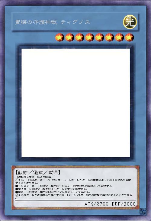 | 「神獣の目覚め」により降臨。 ①:1ターンに1度、カードを1枚ドローし、ドローしたカードの種類によって以下の効果を発動することができる。 ●モンスターカードの場合、相手のモンスターを1体効果を無効にして破壊する。 ●魔法カードの場合、相手の伏せカードをすべて破壊する。 ●罠カードの場合、相手に1000ポイントのダメージを与える。 ②:このカードが表側表示で存在する時、1ターンに1度、相手の攻撃を無効にすることができる。 | |||