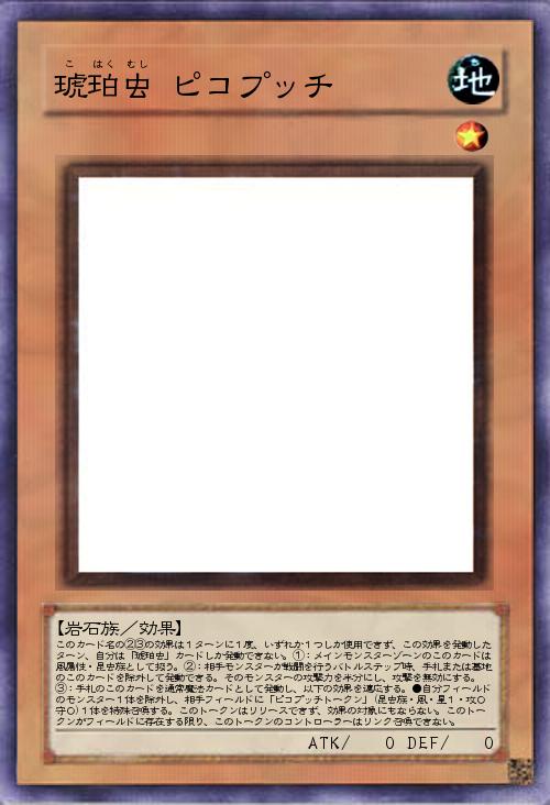 | このカード名の②③の効果は1ターンに1度、いずれか1つしか使用できず、この効果を発動したターン、自分は「琥珀虫」カードしか発動できない。①:メインモンスターゾーンのこのカードは風属性・昆虫族として扱う。②:相手モンスターが戦闘を行うバトルステップ時、手札または墓地のこのカードを除外して発動できる。そのモンスターの攻撃力を半分にし、攻撃を無効にする。 ③:手札のこのカードを通常魔法カードとして発動し、以下の効果を適応する。●自分フィールドのモンスター1体を除外し、相手フィールドに「ピコプッチトークン」(昆虫族・風・星1・攻0守0)1体を特殊召喚する。このトークンはリリースできず、効果の対象にもならない。このトークンがフィールドに存在する限り、このトークンのコントローラーはリンク召喚できない。 | |||