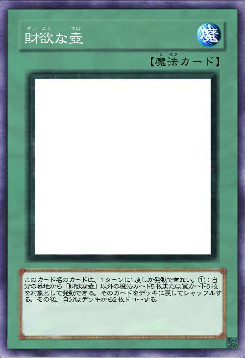 | このカード名のカードは、1ターンに1度しか発動できない。①:自分の墓地から「財欲な壺」以外の魔法カード5枚または罠カード5枚を対象として発動できる。そのカードをデッキに戻してシャッフルする。その後、自分はデッキから2枚ドローする。 | |||