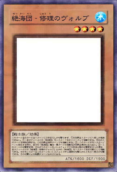 | このカード名のカードは1ターンに2回までしか攻撃できず、①の効果は1ターンに1度しか使用できない。①:自分フィールドの「絶海団」モンスター1体をリリースして発動できる。手札のこのカードを特殊召喚する。この効果は相手ターンでも発動できる。②:このカードがモンスターゾーンに存在する限り、自分の「絶海団」魔法・罠カードの発動及び効果は無効にならない。③:このカードの攻撃宣言時、それがこのターンのバトルフェイズで3回目以降の攻撃宣言だった場合、自分フィールドの「絶海団‐修理のヴォルブ」以外の「絶海団」モンスター1体を対象にして発動できる。そのモンスターはこのターンのバトルフェイズ中に通常の攻撃に加えてもう一度だけ攻撃できる。その攻撃による戦闘ダメージは半分になる。 | |||