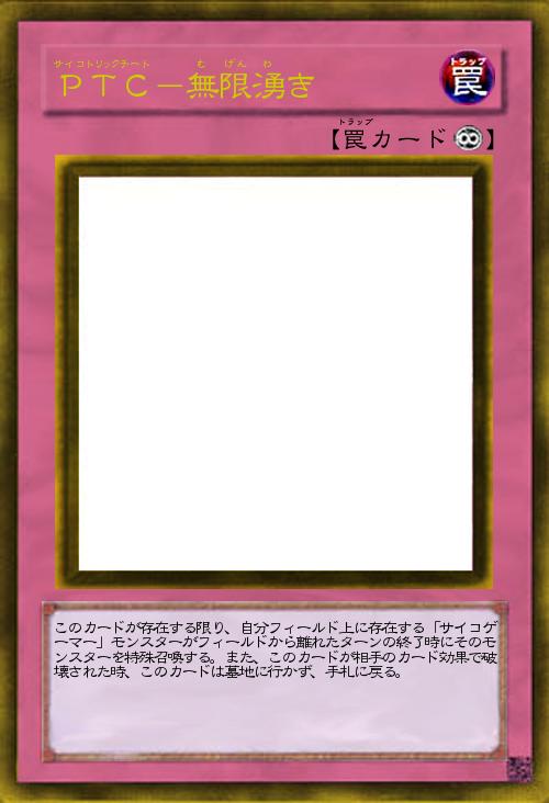 | このカードが存在する限り、自分フィールド上に存在する「サイコゲーマー」モンスターがフィールドから離れたターンの終了時にそのモンスターを特殊召喚する。また、このカードが相手のカード効果で破壊された時、このカードは墓地に行かず、手札に戻る。 | |||