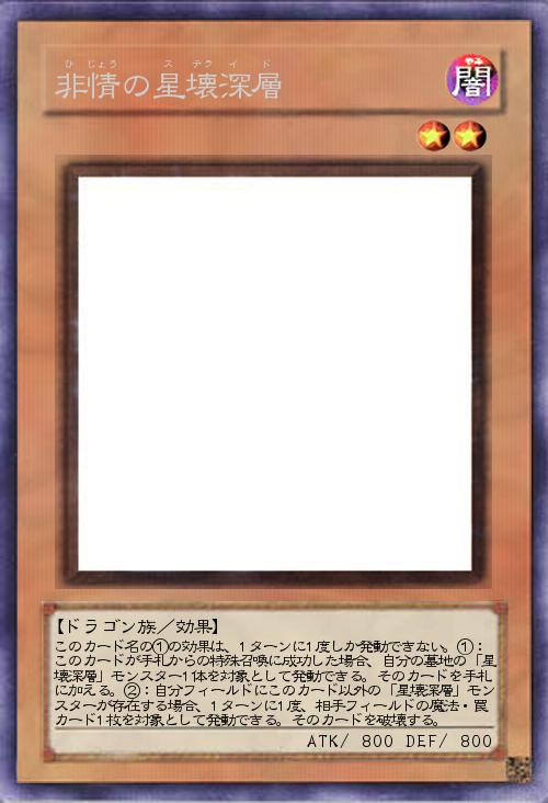 | このカード名の①の効果は、1ターンに1度しか発動できない。①:このカードが手札からの特殊召喚に成功した場合、自分の墓地の「星壊深層」モンスター1体を対象として発動できる。そのカードを手札に加える。②:自分フィールドにこのカード以外の「星壊深層」モンスターが存在する場合、1ターンに1度、相手フィールドの魔法・罠カード1枚を対象として発動できる。そのカードを破壊する。 | |||