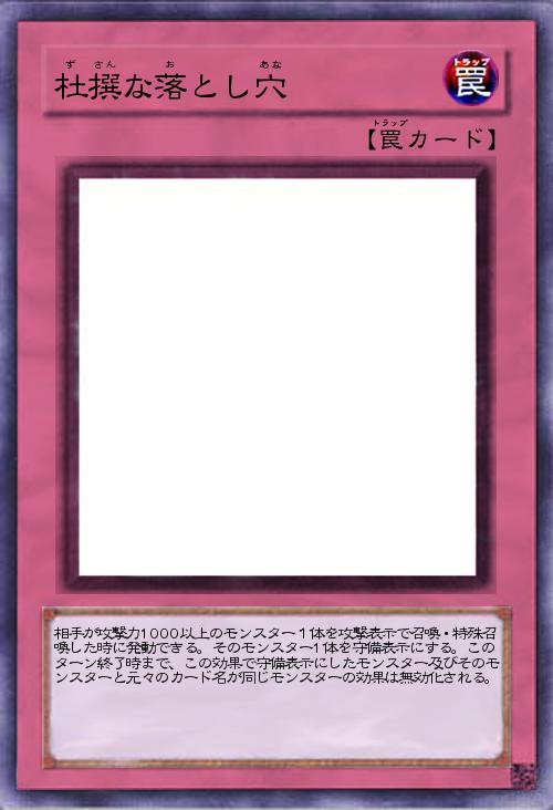 | 相手が攻撃力1000以上のモンスター1体を攻撃表示で召喚・特殊召喚した時に発動できる。そのモンスター1体を守備表示にする。このターン終了時まで、この効果で守備表示にしたモンスター及びそのモンスターと元々のカード名が同じモンスターの効果は無効化される。 | |||