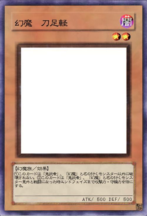 | ①このカードは「鬼武者」、「幻魔」と名の付くモンスター以外に破壊されない。②このカードは「鬼武者」、「幻魔」と名の付くモンスター意外と戦闘になった時エンドフェイズまで攻撃力・守備力を倍にする。 | |||