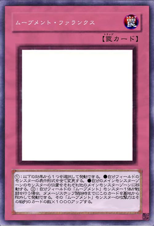 | ①:以下の効果から1つを選択して発動できる。●自分フィールドのモンスターの表示形式を全て変更する。●自分のメインモンスターゾーンのモンスターの位置をそれぞれ他のメインモンスターゾーンに移動する。②:自分フィールドの「ムーブメント」モンスター1体が戦闘を行う場合、ダメージステップ開始時までにこのカードを墓地から除外して発動できる。その「ムーブメント」モンスターの攻撃力はその縦列のカードの数×1000アップする。 | |||