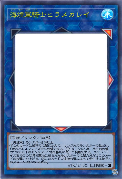 | 「海煌軍」モンスター2体以上 ①このカードは通常の攻撃に加えて、リンク先のモンスターの数だけ、1度のバトルフェイズ中に攻撃できる。②1ターンに1度、手札の攻撃力1000以下のモンスター1体を墓地に送って発動できる。エンドフェイズまでこの効果で墓地に送られたモンスターの攻撃力分だけこのカードの攻撃力を上げる。③このカードの直接攻撃によって発生する相手へのダメージは1000となる。 | |||