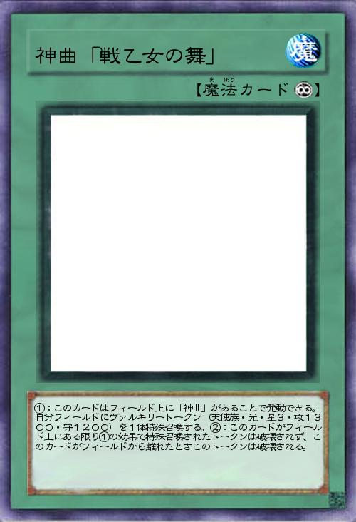 | ①:このカードはフィールド上に「神曲」があることで発動できる。自分フィールドにヴァルキリートークン(天使族・光・星3・攻1300・守1200)を1体特殊召喚する。②:このカードがフィールド上にある限り①の効果で特殊召喚されたトークンは破壊されず、このカードがフィールドから離れたときこのトークンは破壊される。 | |||