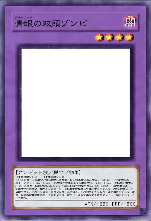 | 「青眼の銀ゾンビ」+「青眼の銀ゾンビ」 (1):このカードの融合召喚に成功した場合、自分の墓地に存在するレベル4以下・守備力1000以下・アンデット族モンスターを2体まで対象にして発動できる。そのモンスターを特殊召喚する。(2):このカードは1度のバトルフェイズに2回まで攻撃できる。(3):このカードが戦闘によって破壊された場合、相手モンスターゾーンに表側攻撃表示で存在するモンスター2体を対象にして発動できる。そのモンスターのコントロールを得る。この効果でコントロールを得たモンスターはカード効果が無効化され、そのモンスターがフィールドで存在する限りアンデット族モンスターとして扱う。 | |||