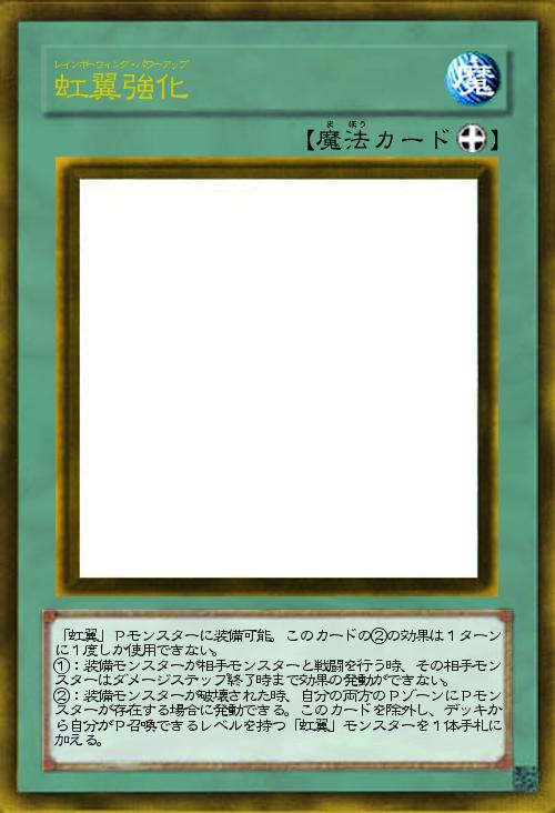| 「虹翼」Pモンスターに装備可能。このカードの②の効果は1ターンに1度しか使用できない。 ①:装備モンスターが相手モンスターと戦闘を行う時、その相手モンスターはダメージステップ終了時まで効果の発動ができない。 ②:装備モンスターが破壊された時、自分の両方のPゾーンにPモンスターが存在する場合に発動できる。このカードを除外し、デッキから自分がP召喚できるレベルを持つ「虹翼」モンスターを1体手札に加える。 | |||