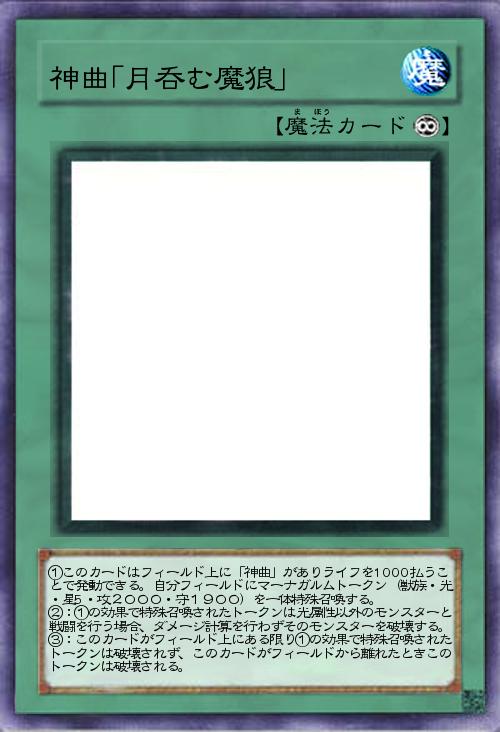 | ①このカードはフィールド上に「神曲」がありライフを1000払うことで発動できる。自分フィールドにマーナガルムトークン(獣族・光・星5・攻2000・守1900)を一体特殊召喚する。 ②:①の効果で特殊召喚されたトークンは光属性以外のモンスターと戦闘を行う場合、ダメージ計算を行わずそのモンスターを破壊する。 ③:このカードがフィールド上にある限り①の効果で特殊召喚されたトークンは破壊されず、このカードがフィールドから離れたときこのトークンは破壊される。 | |||