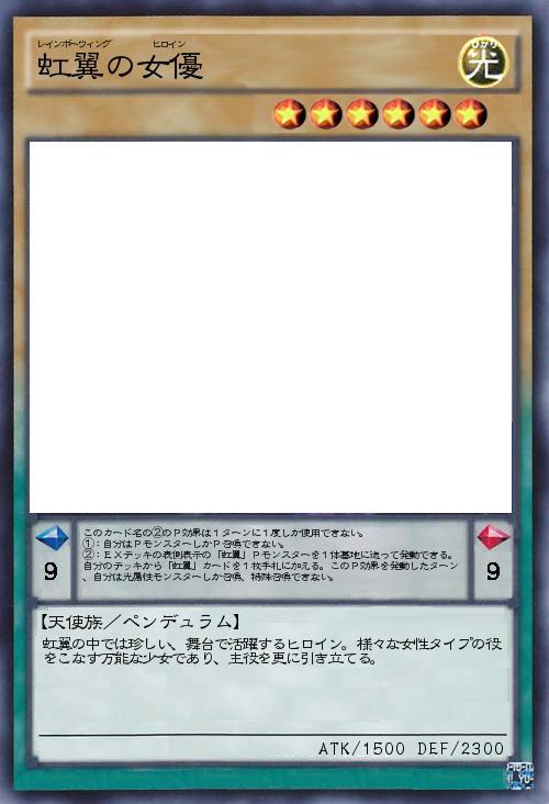 | このカード名の②のP効果は1ターンに1度しか使用できない。 ①:自分はPモンスターしかP召喚できない。 ②:EXデッキの表側表示の「虹翼」Pモンスターを1体墓地に送って発動できる。自分のデッキから「虹翼」カードを1枚手札に加える。このP効果を発動したターン、自分は光属性モンスターしか召喚、特殊召喚できない。 | |||