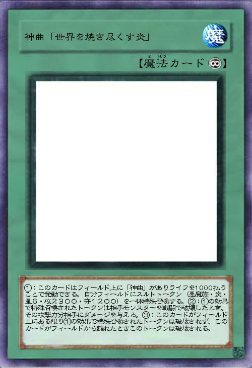 | ①:このカードはフィールド上に「神曲」がありライフを1000払うことで発動できる。自分フィールドにスルトトークン(悪魔族・炎・星6・攻2300・守1200)を一体特殊召喚する。②:①の効果で特殊召喚されたトークンは相手モンスターを戦闘で破壊したとき、その攻撃力分相手にダメージを与える。③:このカードがフィールド上にある限り①の効果で特殊召喚されたトークンは破壊されず、このカードがフィールドから離れたときこのトークンは破壊される。 | |||