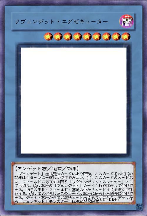 | 「ヴェンデット」儀式魔法カードにより降臨。このカード名の②③の効果は1ターンに一度しか使用できない。①:このカードのカード名は、フィールドに存在する限り「リヴェンデット・スレイヤー」としても扱う。②:墓地の「ヴェンデット」カード1枚を除外して発動できる。相手の手札・フィールド・墓地の中からカード1枚を選んで除外する。③:儀式召喚したこのカードが墓地に送られた場合に発動できる。デッキ・墓地から儀式魔法カード一枚を手札に加え、デッキから「ヴェンデット」モンスター1体を墓地へ送る。 | |||