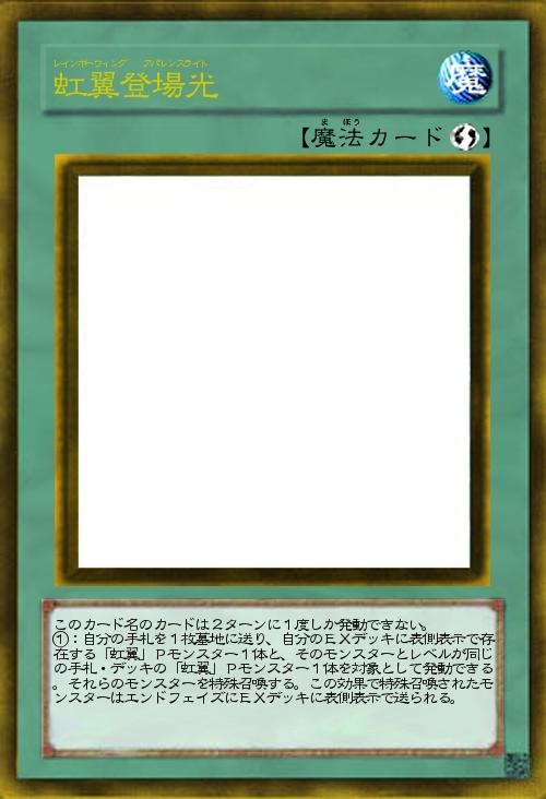 | このカード名のカードは2ターンに1度しか発動できない。 ①:自分の手札を1枚墓地に送り、自分のEXデッキに表側表示で存在する「虹翼」Pモンスター1体と、そのモンスターとレベルが同じの手札・デッキの「虹翼」Pモンスター1体を対象として発動できる。それらのモンスターを特殊召喚する。この効果で特殊召喚されたモンスターはエンドフェイズにEXデッキに表側表示で送られる。 | |||