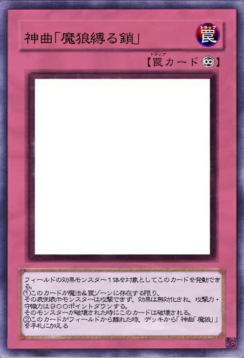 | フィールドの効果モンスター1体を対象としてこのカードを発動できる。 ①このカードが魔法&罠ゾーンに存在する限り、 その表側表示モンスターは攻撃できず、効果は無効化され、攻撃力・守備力は900ポイントダウンする。 そのモンスターが破壊された時にこのカードは破壊される。 ②このカードがフィールドから離れた時、デッキから「神曲「魔狼」」を手札に加える | |||