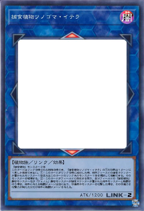 | 「捕食植物」モンスター2体 このカードはリンク召喚でのみ特殊召喚でき、「捕食植物ツノゴマ・イテラ」の①の効果は1ターンに1度しか使用できない。①:このカードがリンク召喚に成功した時、相手フィールドの捕食カウンターが置かれたモンスター1体またはこのカードのリンク先のモンスター1体を選択して発動できる。そのモンスターを破壊する。②:このカードがフィールドに存在する限り、自分フィールドの「捕食植物」融合モンスター及び「ヴェノム」融合モンスターが捕食カウンターが置かれた相手モンスターと戦闘を行う場合、相手に与える戦闘ダメージは倍になり、守備表示モンスターを攻撃した場合、その守備力を攻撃力が超えた分だけ相手に戦闘ダメージを与える。 | |||