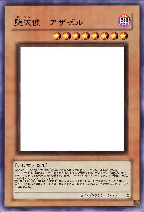 | このカード名の特殊召喚及び①と②の効果の使用はそれぞれ1ターンに1度しかできない。 ①このカードと「堕天使」カードを1枚手札から捨てて発動できる。デッキから「堕天使」モンスター1体を表側守備表示で特殊召喚する。自分フィールドにモンスターが存在しない場合、相手はこの効果に対してチェーンできない。 ②LPを1000払い、墓地の「堕天使」魔法・罠カード1枚を対象として発動できる。その魔法・罠カードの効果を適用する。その後、墓地のそのカードをデッキに戻す。この効果は相手ターンでも発動できる。 | |||