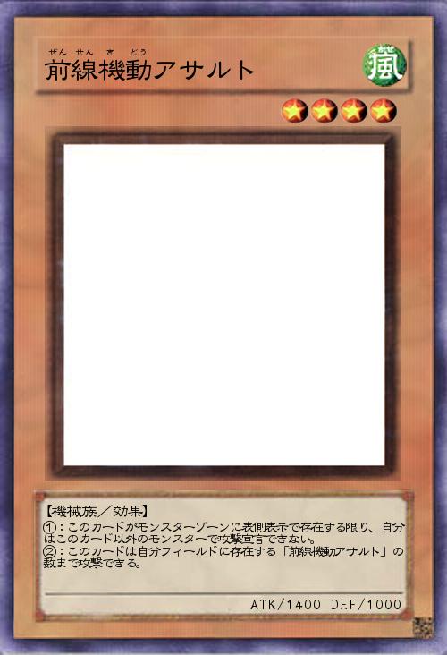 | ①:このカードがモンスターゾーンに表側表示で存在する限り、自分はこのカード以外のモンスターで攻撃宣言できない。 ②:このカードは自分フィールドに存在する「前線機動アサルト」の数まで攻撃できる。 | |||