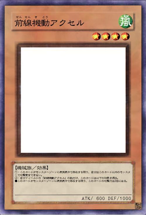 | ①:このカードがモンスターゾーンに表側表示で存在する限り、自分はこのカード以外のモンスターで攻撃宣言できない。 ②:自分フィールドの「前線機動アクセル」の数だけ、このカードは以下の効果を得る。 ●このカードがモンスターゾーンに表側表示で存在する限り、このカードの攻撃力は2倍になる。 | |||