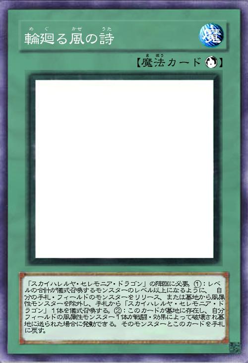 | 「スカイハレルヤ・セレモニア・ドラゴン」の降臨に必要。①:レベルの合計が儀式召喚するモンスターのレベル以上になるように、 自分の手札・フィールドのモンスターをリリース、または墓地から風属性モンスターを除外し、手札から「スカイハレルヤ・セレモニア・ドラゴン」1体を儀式召喚する。②:このカードが墓地に存在し、自分フィールドの風属性モンスター1体が戦闘・効果によって破壊され墓地に送られた場合に発動できる。そのモンスターとこのカードを手札に戻す。 | |||
