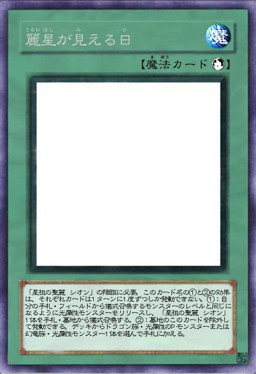 | 「星祖の聖麗 シオン」の降臨に必要。このカード名の①と②の効果は、それぞれカードは1ターンに1度ずつしか発動できない。①:自分の手札・フィールドから儀式召喚するモンスターのレベルと同じになるように光属性モンスターをリリースし、「星祖の聖麗 シオン」1体を手札・墓地から儀式召喚する。②:墓地のこのカードを除外して発動できる。デッキからドラゴン族・光属性のPモンスターまたは幻竜族・光属性モンスター1体を選んで手札に加える。 | |||