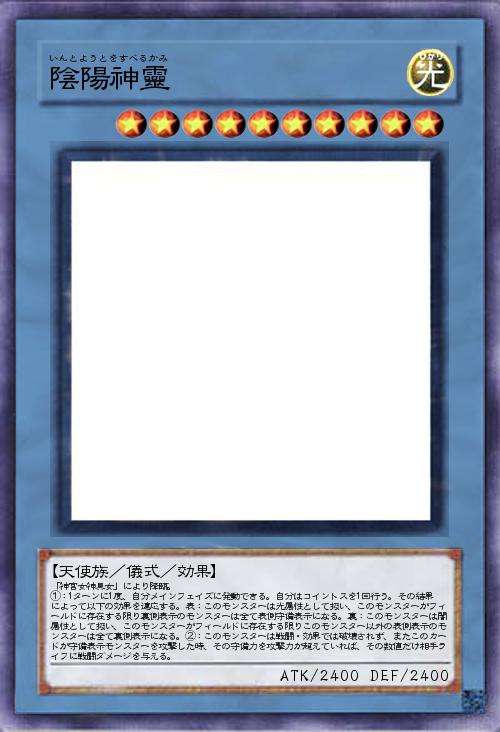 | 「神宮女神具女」により降臨。 ①:1ターンに1度、自分メインフェイズに発動できる。自分はコイントスを1回行う。その結果によって以下の効果を適応する。表:このモンスターは光属性として扱い、このモンスターがフィールドに存在する限り裏側表示のモンスターは全て表側守備表示になる。裏:このモンスターは闇属性として扱い、このモンスターがフィールドに存在する限りこのモンスター以外の表側表示のモンスターは全て裏側表示になる。②:このモンスターは戦闘・効果では破壊されず、またこのカードが守備表示モンスターを攻撃した時、その守備力を攻撃力が超えていれば、その数値だけ相手ライフに戦闘ダメージを与える。 | |||