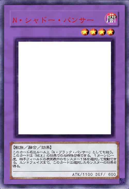 | このカード名はルール上「N・ブラック・パンサー」としても扱う。このカードは「NEX」の効果でのみ特殊召喚できる。1ターンに一度、相手フィールドの表側表示のモンスター1体を選択して発動できる。エンドフェイズまで、このカードは選択したモンスターの効果を得る。 | |||