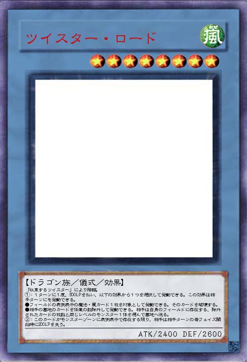 | 「収束するツイスター」により降臨。 ①:1ターンに1度、500LPを払い、以下の効果から1つを選択して発動できる。この効果は相手ターンにも発動できる。 ●フィールドの表側表示の魔法・罠カード1枚を対象として発動できる。そのカードを破壊する。 ●相手の墓地のカードを任意の数除外して発動できる。相手は自身のフィールドに存在する、除外されたカードの枚数と同じレベルのモンスター1体を選んで墓地へ送る。 ②:このカードがモンスターゾーンに表側表示で存在する限り、相手は相手ターンの毎フェイズ開始時に200LPを失う。 | |||